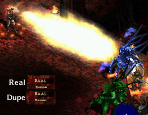 [[Image:Mon-baal-names.jpg | [[Image:Mon-baal-names.jpg|thumb|300px|Baal above the Vile Effigy.]]Baal can be discerned from his Vile Effigy duplicate by carefully observing the names. Note that in the hover name of real Baal, pictured above in this image, the "B" of Baal is slightly offset to the left from the "D" of Demon. The B and the D in the hover of the Vile Effigy are exactly aligned. You will also notice which is which since the Vile Effigy is spawned with just half of Baal's hit points, so even though their health bars look the same, the duplicate will appear to take damage much more quickly. | ||